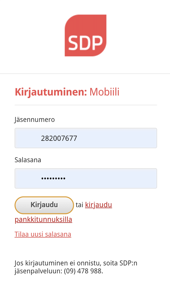 Logga in i mobilappen på adressen mobiili.sdp.fi, antingen med nätbankskoder eller med ditt medlemsnummer och lösenord. Du kan själv skapa ett eget lösenord.