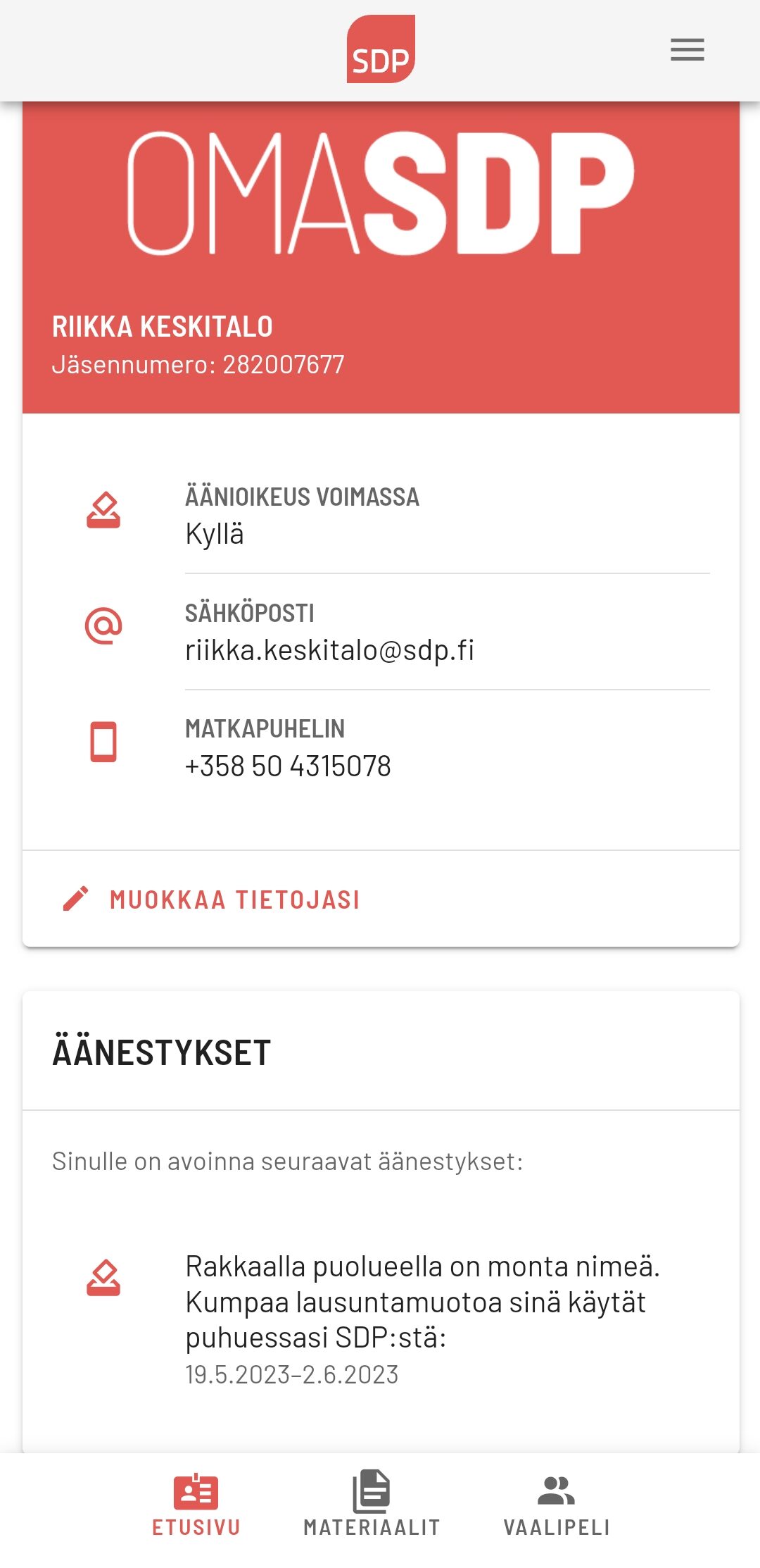 Mikäli sinulla on teknisiä ongelmia äänestyksen kanssa, voit olla yhteydessä 30.6. asti Riikka Keskitaloon (puh. 050 431 5078). Tämän jälkeen voit olla yhteydessä 7.7. asti puolueen vaihteeseen (puh. (09) 478 988).