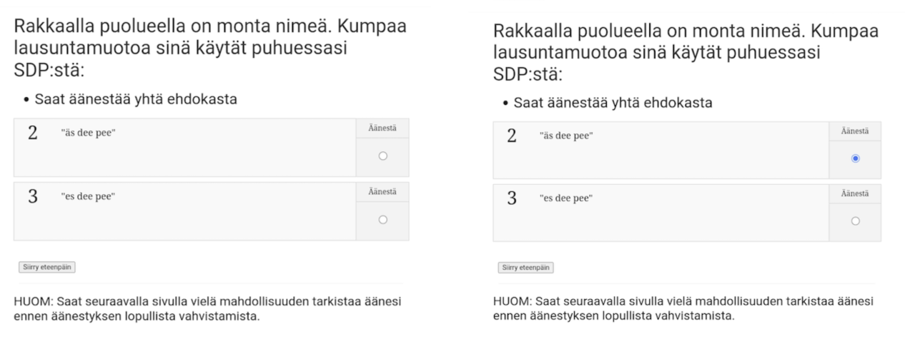 Valitse haluamasi vaihtoehto täppäämällä ehdokkaan rivin lopussa olevan ympyrän sisältä ja klikkaa ”Siirry eteenpäin”. Seuraavalla sivulla voit vielä tarkistaa valintasi ennen äänestyksen lopullista vahvistamista.
