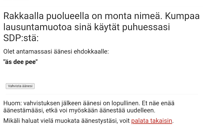 Tarkista, että olet valinnut oikean vaihtoehdon ja klikkaa ”Vahvista äänesi”, jonka jälkeen saat ilmoituksen ”Äänesi on tallennettu”. Tämän jälkeen sinulla ei ole enää mahdollista vaihtaa ääntäsi.